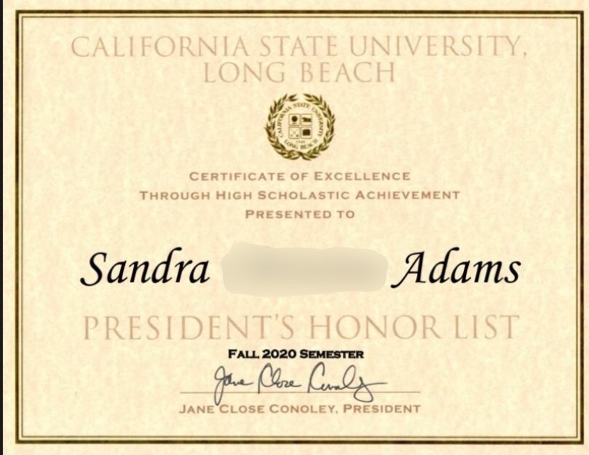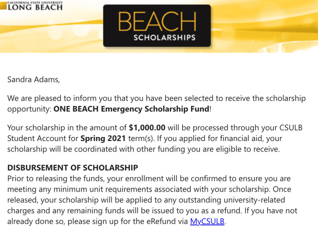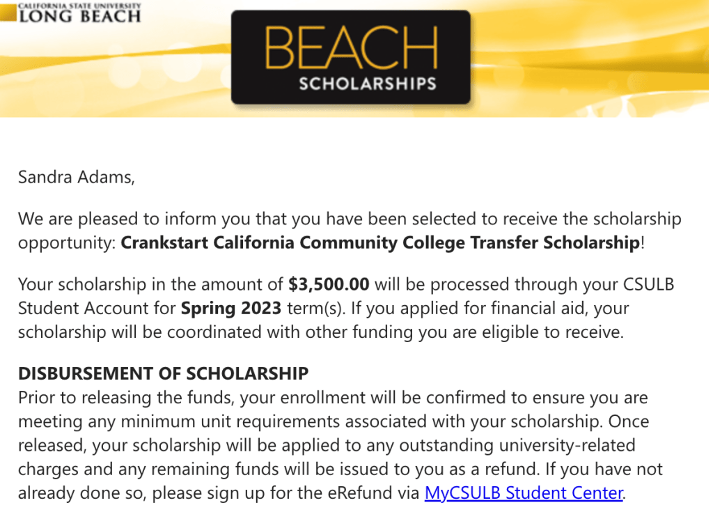 Scholarship Recipient; CSU Long Beach